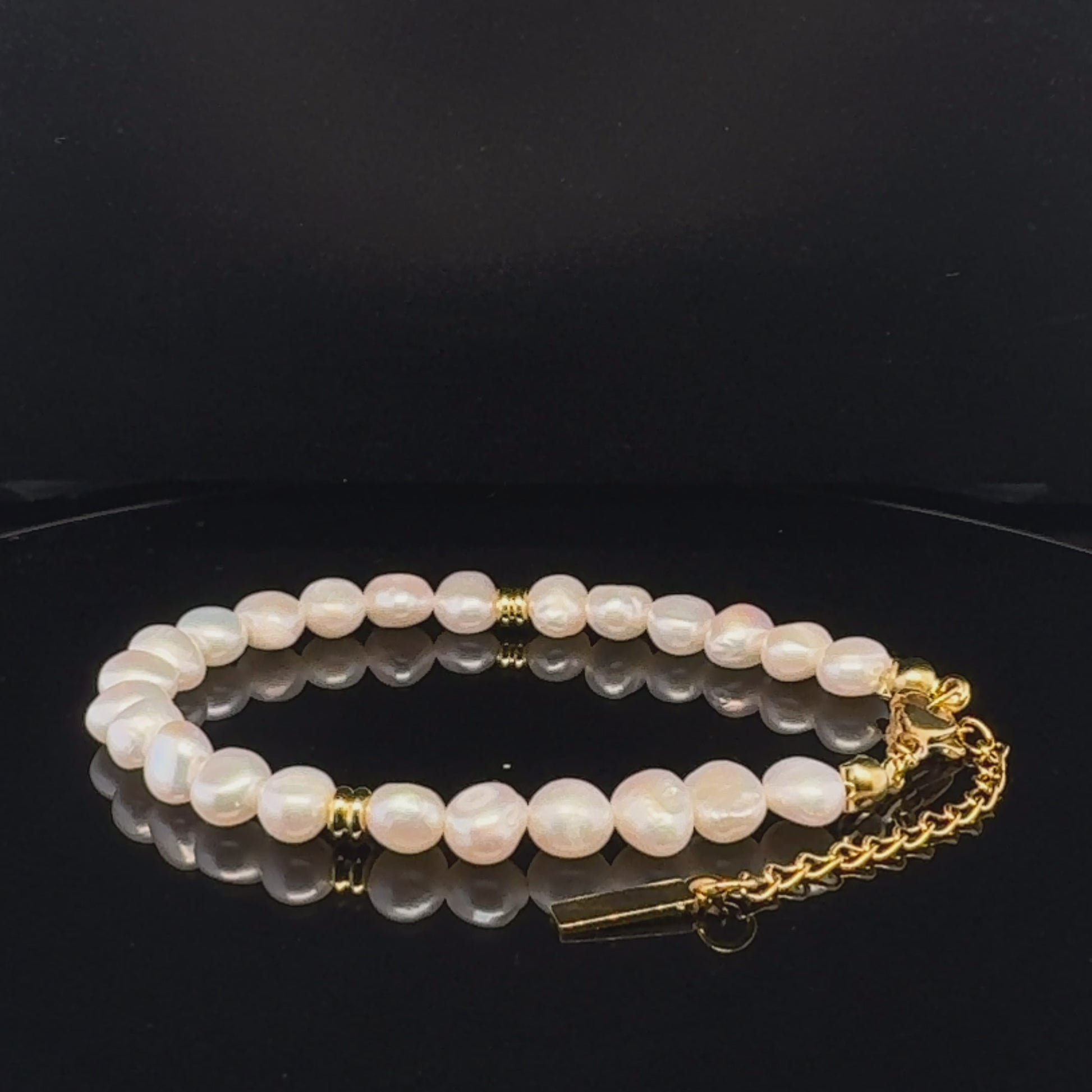 Inspired by tropical islands and endless days basking in the sun. This handmade freshwater pearl bracelet makes a beautiful gift or precious keepsake. Also available in a matching necklace, ~ Crafted from ethically sourced freshwater pearls. Clasp, extension chain, and feature beads .925 Sterling Silver with a 18k Gold plating. As this is a handmade item the size and shape of pearls and beads used may vary, making each bracelet truly unique. Chain length: 16cm+ 5cm extension chain.