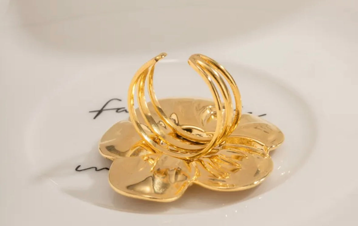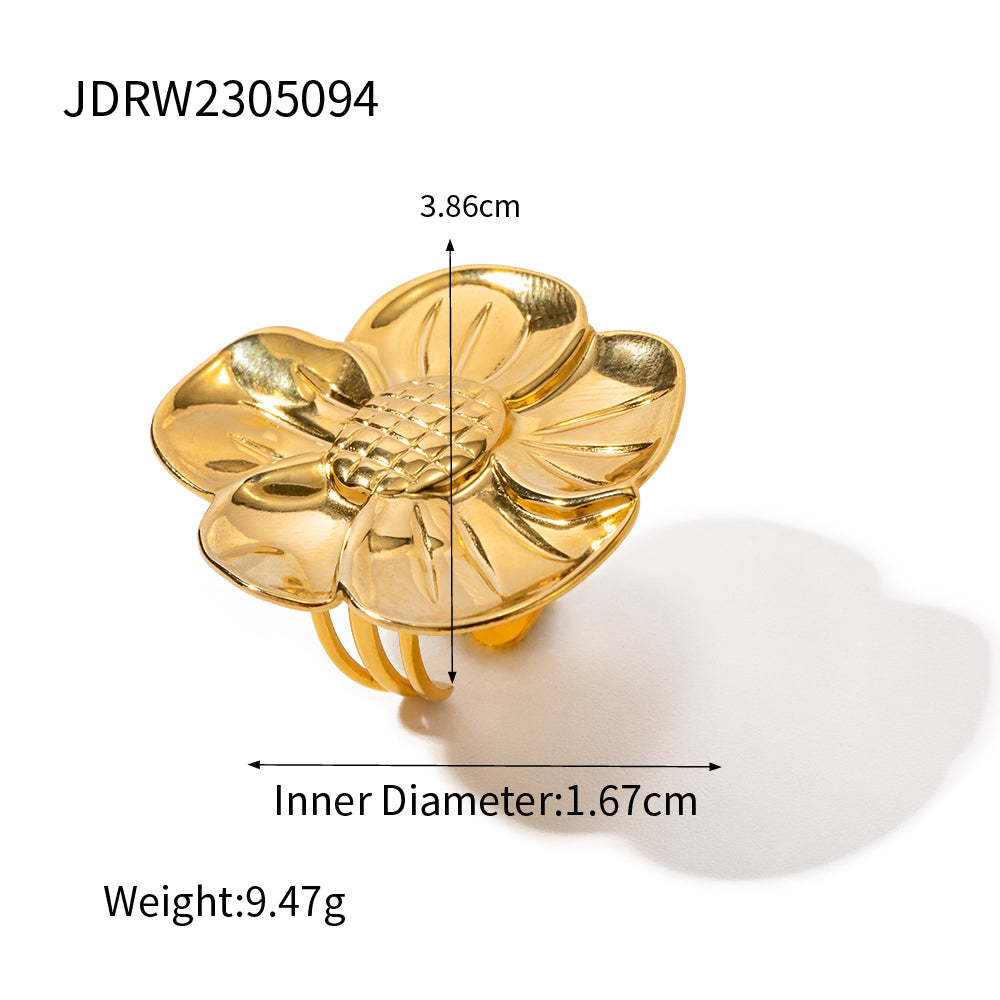 This open ring boasts a unique and stylish gold flower design, perfect for those who want to stand out with a touch of retro elegance. Crafted from durable stainless steel and plated with luxurious 18K gold, it offers both durability and sophistication. Its open design ensures comfort and adjustability for different finger sizes, making it suitable for all-day wear. Whether worn alone or paired with other accessories, this ring is sure to catch the eye and add a charming flair to any outfit.