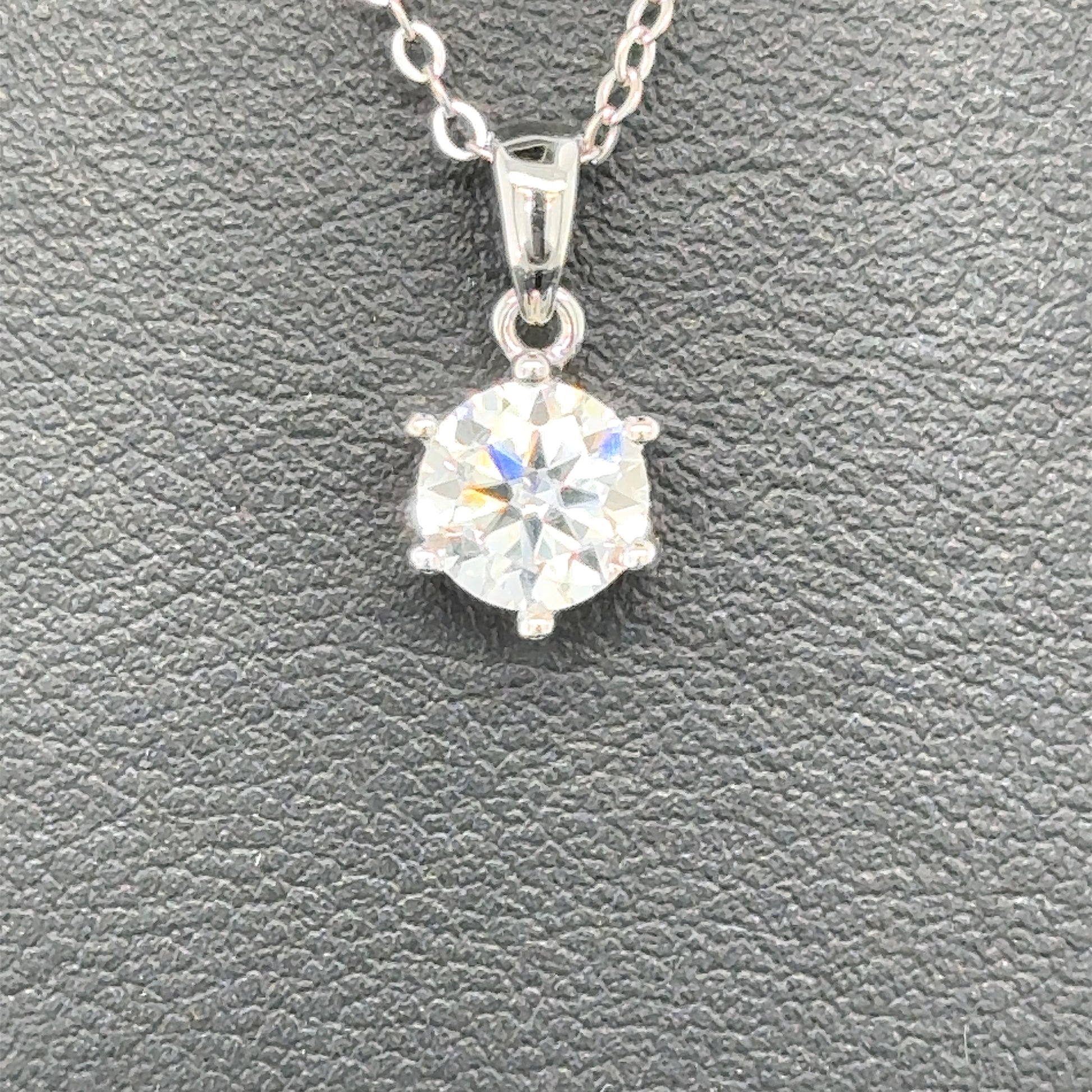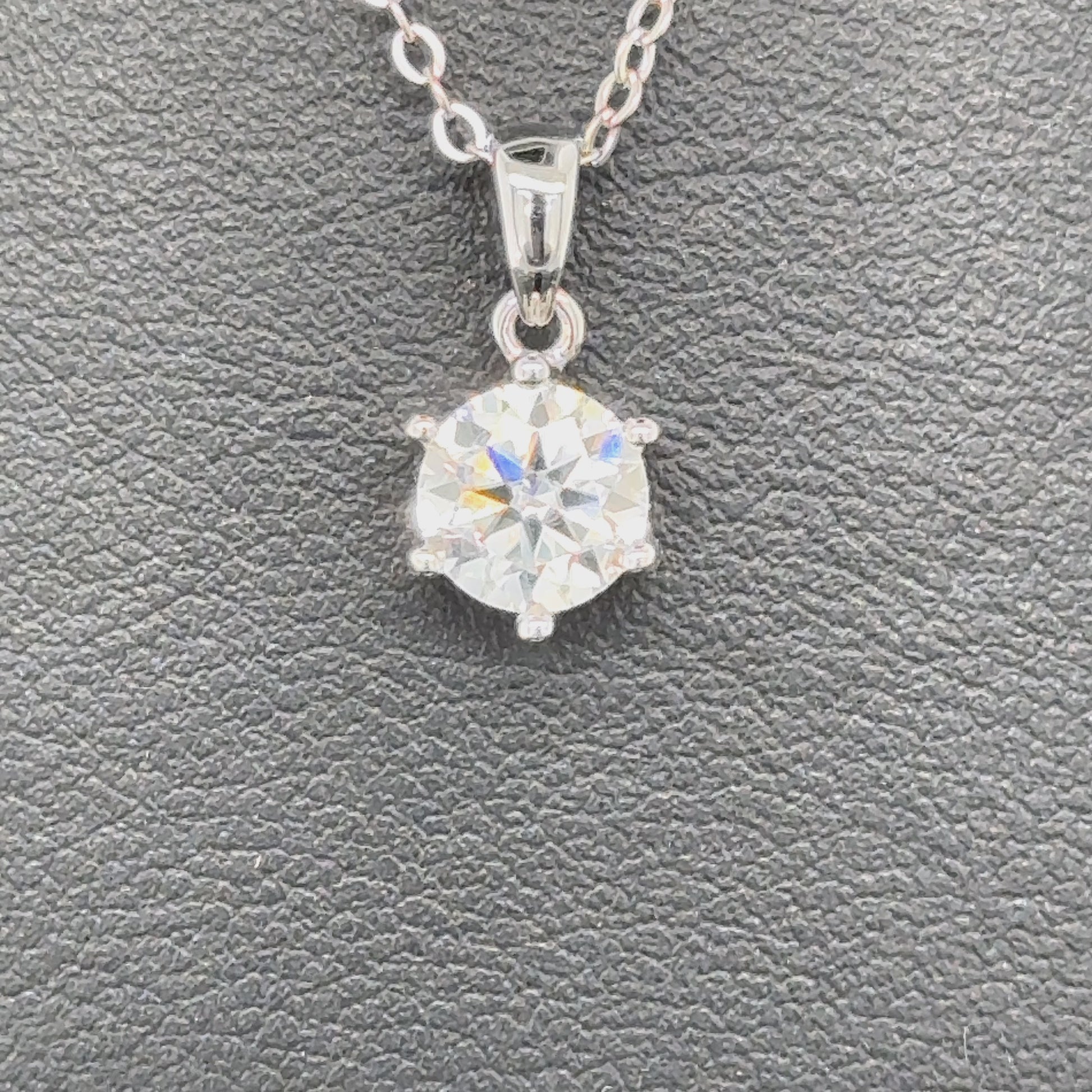 The classic elegance of this sparkling white diamond pendant is suspended on a sleek elegant silver chain. They light catches its many facets, promising to add a touch of glamour to any outfit. The shape and cutting style is round brilliant and is 1.0 carat in weight. The diamonds are Moissanite which is an ethical alternative to natural diamonds and are produced in an environmentally friendly way. The pendant comes with a certified GRA Report and a 12 month warranty. Each diamond has her own GRA Report number.