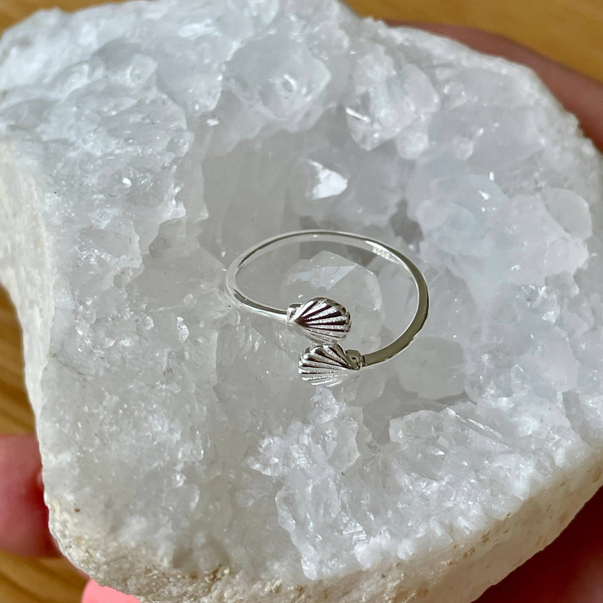 Hold tight to your dreams friends and lovers, as one day we will cross oceans and be together once more. This dainty ring features two silver scallop shells wrapped together in a ring... but never quite touching. This ring signifies the oceans that keep us apart from our family, loved ones, or new adventures. One size fits most - adjustable/wrap ring style. ~ Crafted from .925 Sterling Silver.