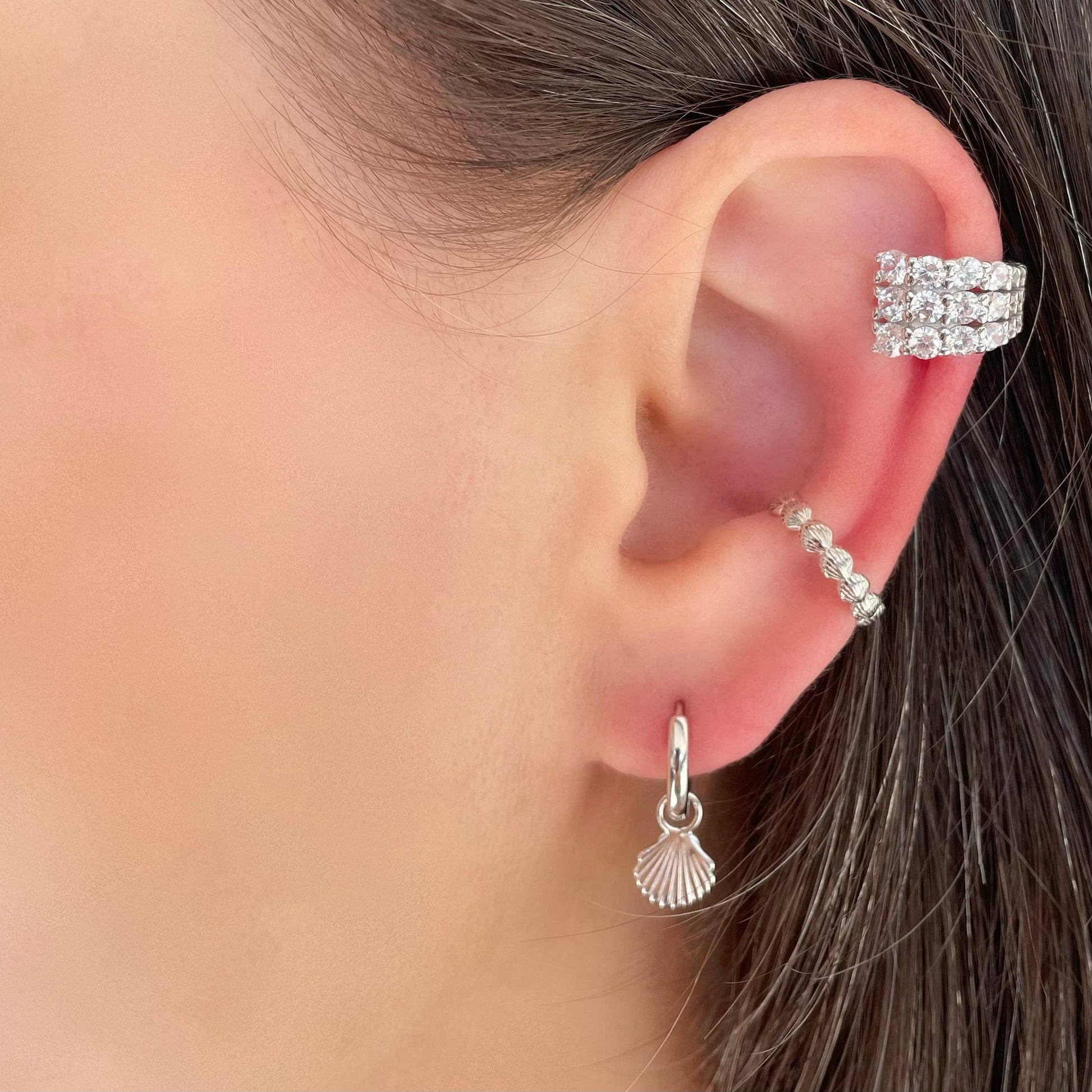 The morning sun glistens upon seashells on the shoreline. These silver shell earrings are prefect for everyday wear. ~ Crafted from .925 Sterling Silver with a luminous rhodium plating for added shine and protection. Scallop shaped charm loosely suspended on a thick 12mm huggie hoop. Inside hoop dimensions 10mm fit around ear.